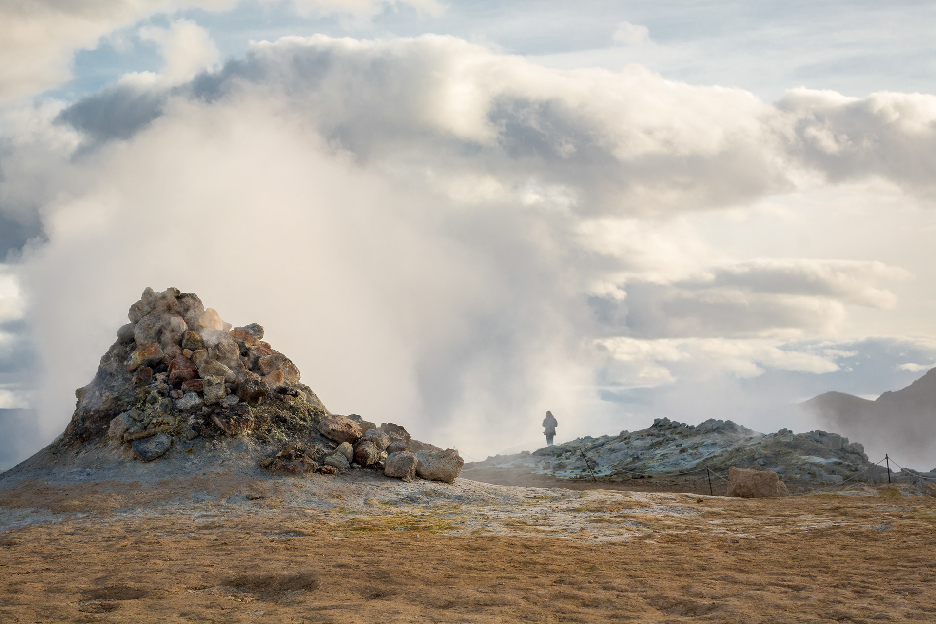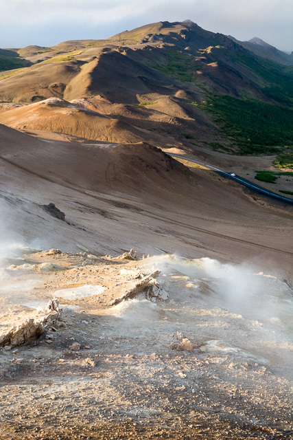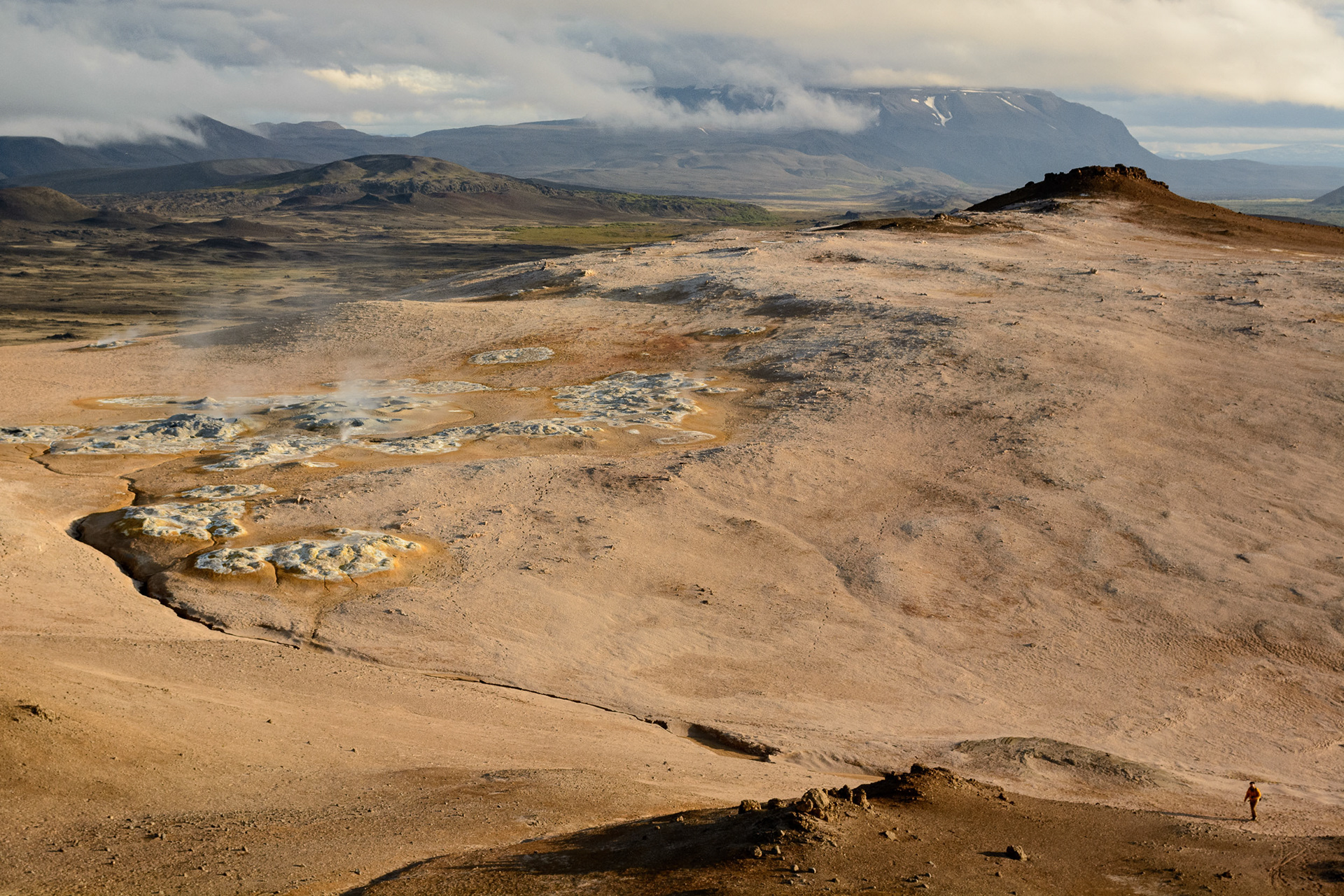 In northern Iceland, in the Námaskarð area around Myvatn Lake is Hverir, a high-temperature geothermal area with fumaroles and steaming, bubbling mud pits. The steam from these pits lingers low in the air, clinging to the surrounding hills. A strenuous hike up Mt. Námafjall rewards you with sweeping views of this other-worldly landscape, the only evidence of mankind seen in the narrow road slicing through the landscape and in tracks leaving imprints in the earth.