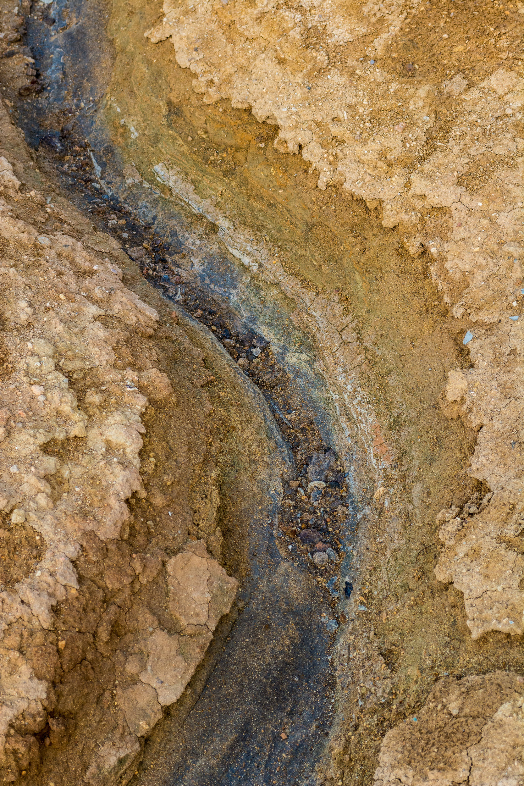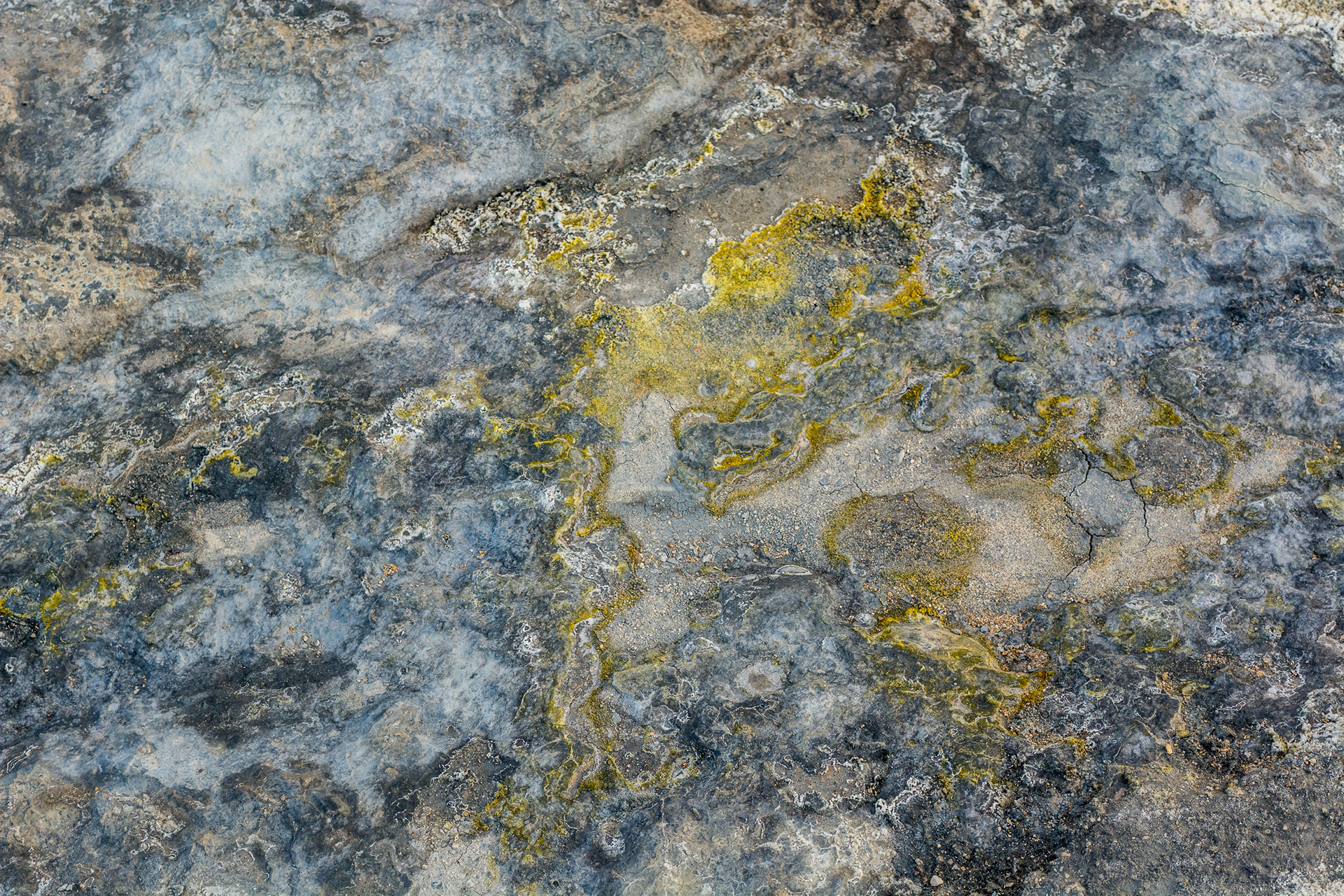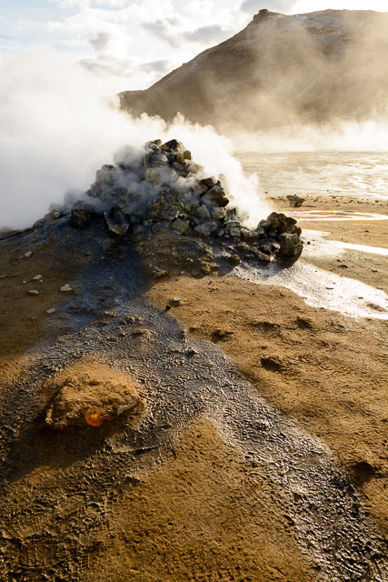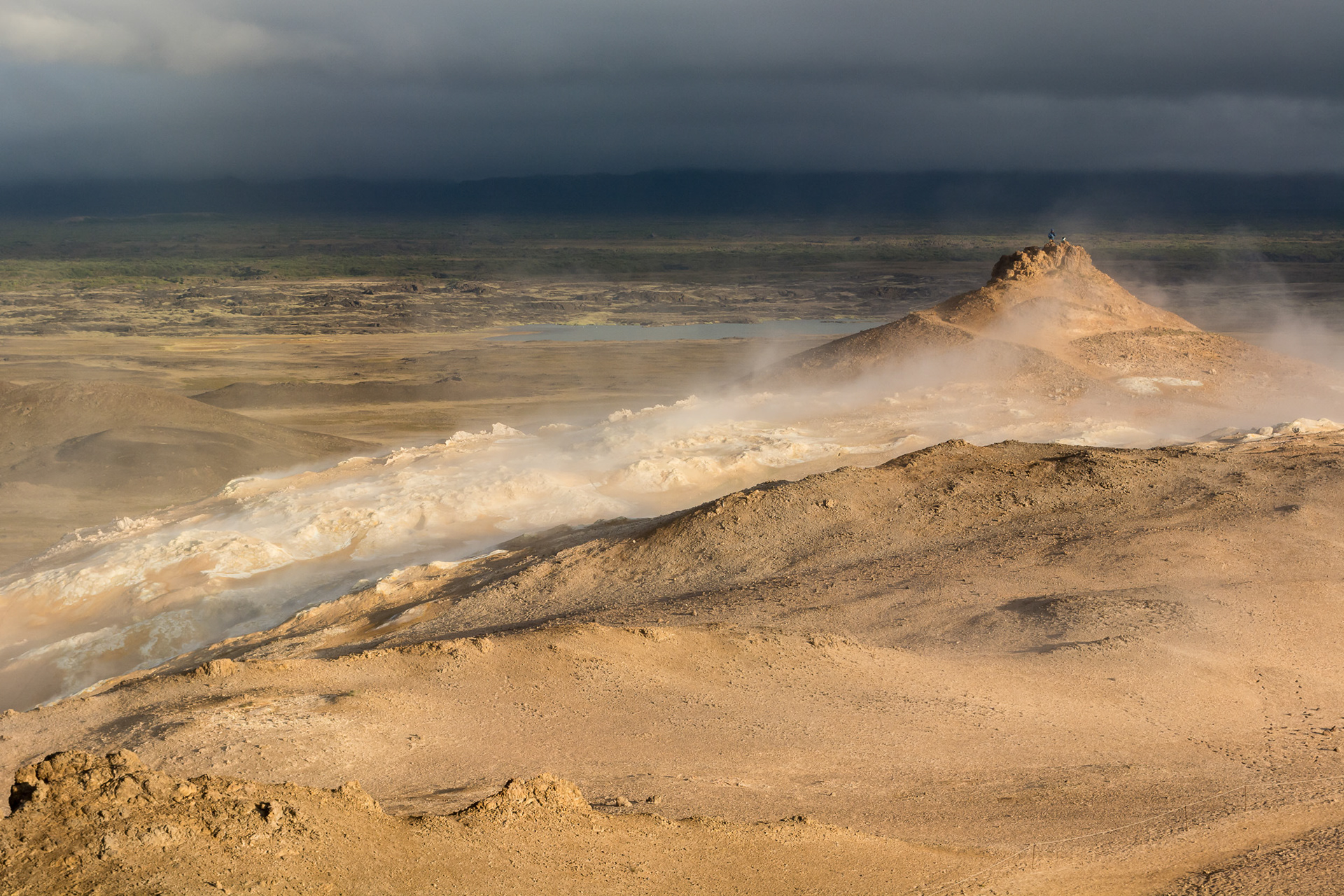 In northern Iceland, in the Námaskarð area around Myvatn Lake is Hverir, a high-temperature geothermal area with fumaroles and steaming, bubbling mud pits. The steam from these pits lingers low in the air, clinging to the surrounding hills. A strenuous hike up Mt. Námafjall rewards you with sweeping views of this other-worldly landscape, the only evidence of mankind seen in the narrow road slicing through the landscape and in tracks leaving imprints in the earth.